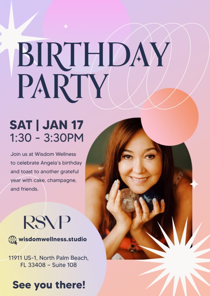 Join us for a joyful evening at Wisdom Wellness as we gather to celebrate Angela’s birthday in good company. This special celebration will feature cake, champagne, and time to connect with friends in a relaxed, uplifting atmosphere.