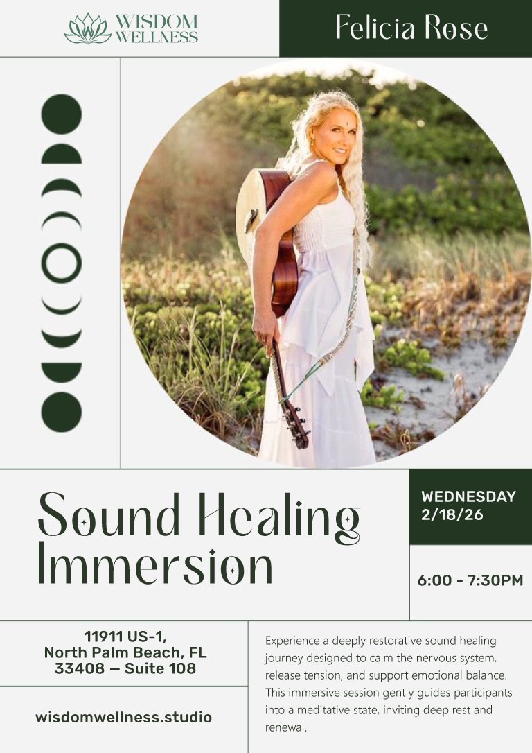 With over 30 years of experience, Felicia Rose creates a soothing soundscape using crystal singing bowls, harmonium, flutes, drums, guitar, and intuitive vocals. Rooted in clinically informed sound therapy principles and ancient-inspired practices, her work supports relaxation, presence, and inner balance.